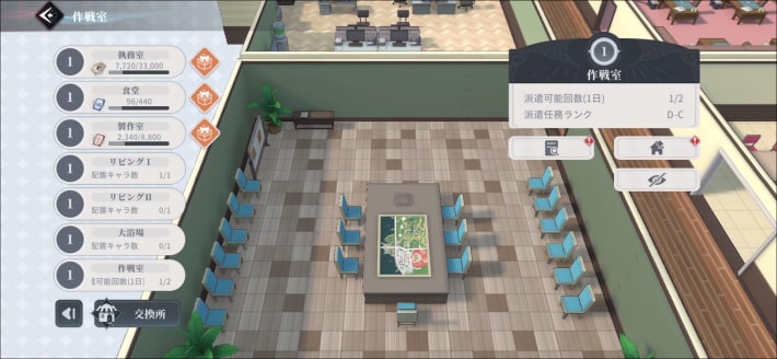 作戦室 | ★★★★★ ・派遣任務を受注できる ・派遣回数を増やすために最優先で強化 |
