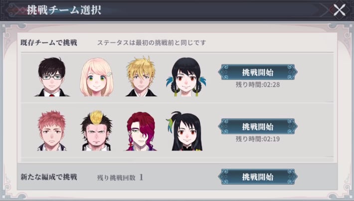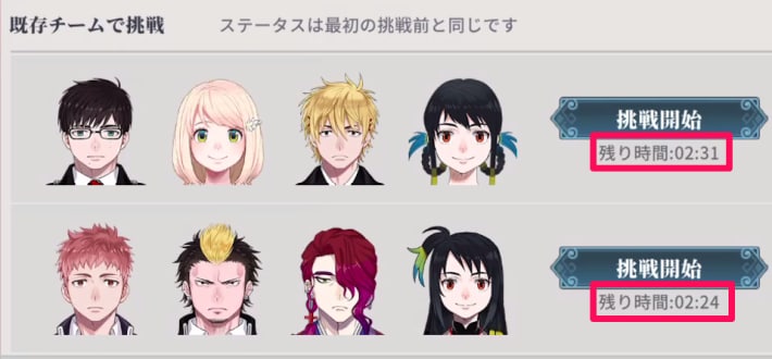 残り時間は、チームごとに別々でカウントされます。1つのチームが制限時間を迎え敗北してしまった場合も、新たなチームを組み挑戦することで挑戦を続行できます。