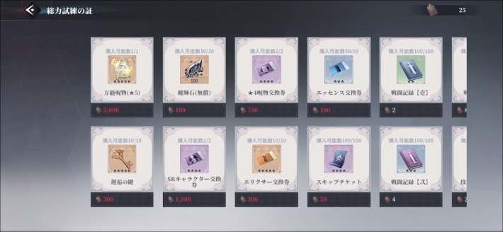 各段階のクリアやランキング報酬で獲得できる総力試練の証は、専用の交換所でさまざまな報酬と交換できます。魔輝石や各種育成素材のほか、万能呪物(★5)、エリクサー交換券、技術指南書【肆】などの貴重な素材も獲得可能です。