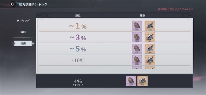 各週で獲得できるシーズンランクPt(総力試練ボーナス)には、前週の結果が一部反映されます。各週のボーナスPtが少しずつ最終ボーナス値に影響するため、継続的に総力試練に挑戦して高いPtの獲得を目指しましょう。