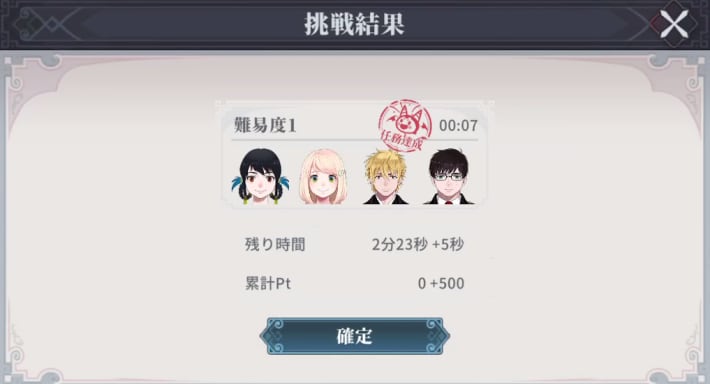 1段階クリアすると、制限時間とポイントが増加し次の段階が解放されます。次の段階には、既存の挑戦で使用した編成で続けて挑戦できるほか、新たな編成を組んで挑戦することも可能です。
