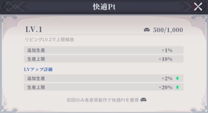 初めて家具を製作した際は、快適Ptを上げることが可能です。快適Ptは快適レベルを上げるのに必要であり、一定までPtを溜めた状態でリビングのレベルを上げると上昇します。