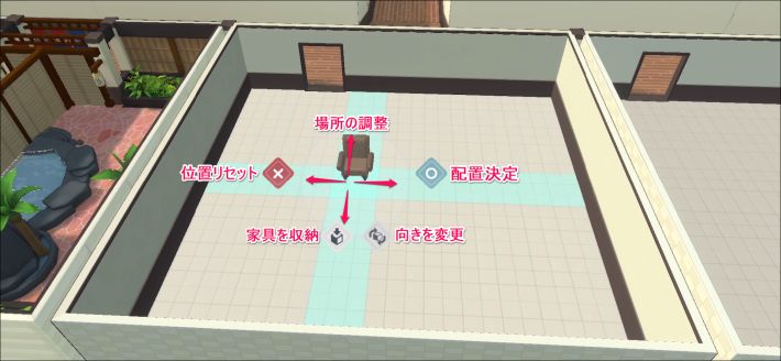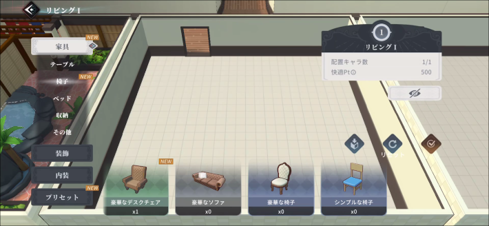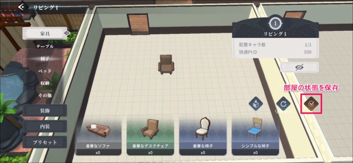 家具の配置が完了したら、部屋の状態を保存しましょう。上手く配置できなかった場合は家具の全収納や部屋状態のリセットも可能です。