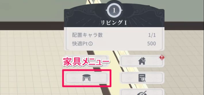 家具の配置は、リビングで行うことができます。マイルームでリビングに移動したあと、家具メニューを開きましょう。