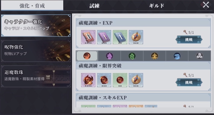 修練の鍵/退魔の鍵は、チャレンジの強化・育成に挑戦するために必要です。強化・育成は、キャラの育成に欠かせないチャレンジとなっているため、毎日の補充や補充用の鍵を活用して積極的に挑戦しましょう。
