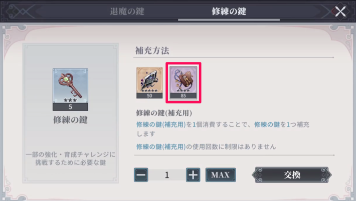修練の鍵(補充用)、退魔の鍵(補充用)を消費することで、それぞれの鍵を補充することもできます。魔輝石での補充と異なり1日の補充回数に制限はありません。