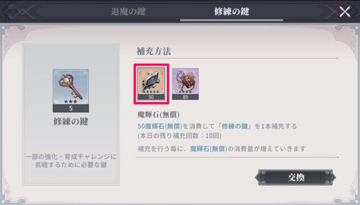 魔輝石(無償)を消費して、鍵を1本補充することも可能です。1日10回まで補充することができ、補充を行うごとに消費する魔輝石の量が増加します。