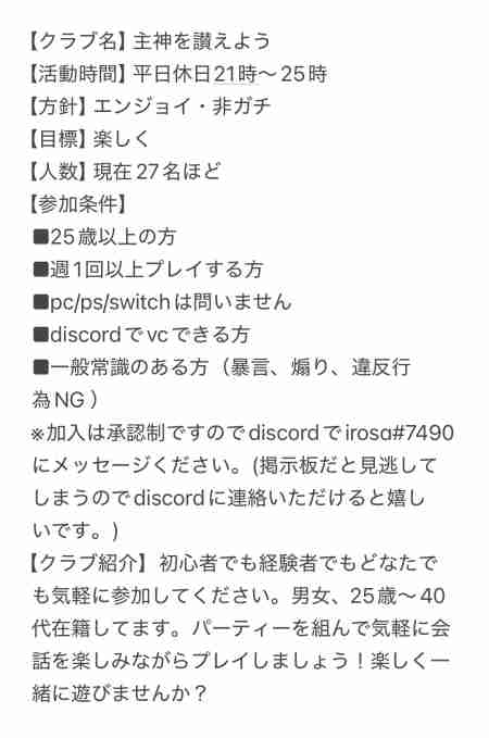 加入条件【社会人限定、VCはdiscord 積極的にVC入ってきてくれる方募集しています。みんなが気持ちよくゲームできるよう配慮できる方、楽しむためにゲームしているので、不快に感じるような言動や行動を慎める方、週2位はインできて、長期インできない時は連絡くれる方、ガチすぎるのも✖️ですが、ふざけすぎて毎回ゲームにならないのも✖️ですね(笑)対戦ゲームなので、負けてもナイスファイトで終わりましょう!】