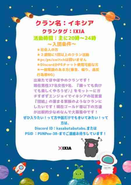 掛け持ちOK、2週間に1回来れる人、負けてもドンマイと言える人、カジュアル多め、ランクはゴールド帯が殆ど、デュオでもOKな人、小規模で同じ人とやる可能性大、気さくな人が多い、まったり、年齢制限:20歳〜寿命まで、子持ち歓迎、積極的にメンバーと絡める人、上からの物言い・誹謗中傷禁止