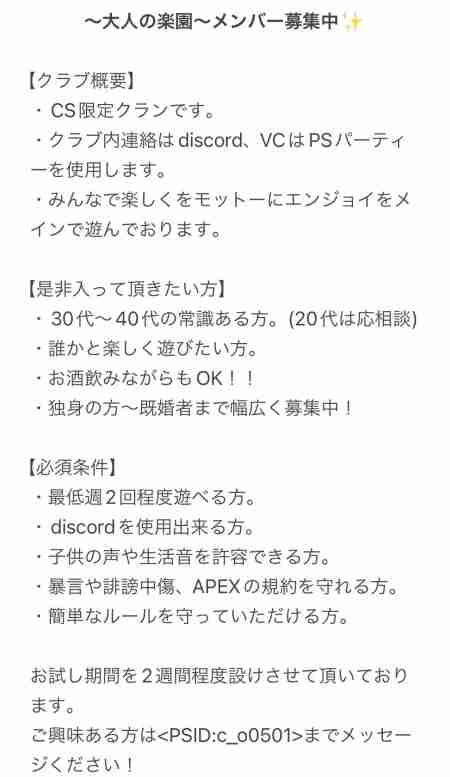 メンバー数:現在28名VCチャット:PSVCのみ