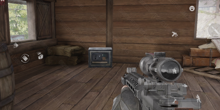 荷揚げ場の鍵部屋。長い武器ケース2個、大型の武器ケース1個、家庭用救急キット1個が置かれている。棚に武器のカスタムパーツが置かれている。