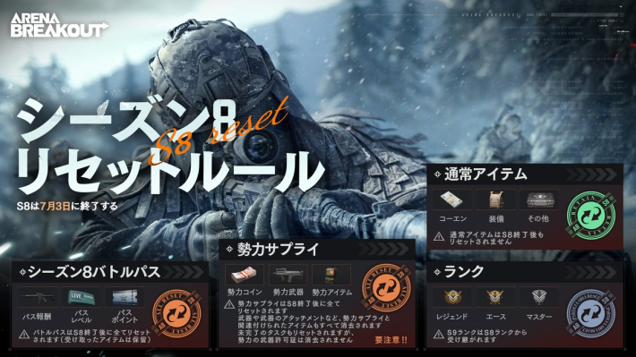 アリーナブレイクアウトのシーズン9(S9)開始情報をまとめています。開始時刻や勢力サプライの消去ルール、引継ぎ要素、公式のQ&Aを掲載。アリブレ新シーズンについて調べる際はお役立て下さい。