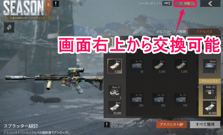 バトルパス画面の右上からシーズンポイントとアイテムを交換できる。毎週月曜日14時に購入制限が解除されるため、欲しいアイテムをこまめに購入しておこう。