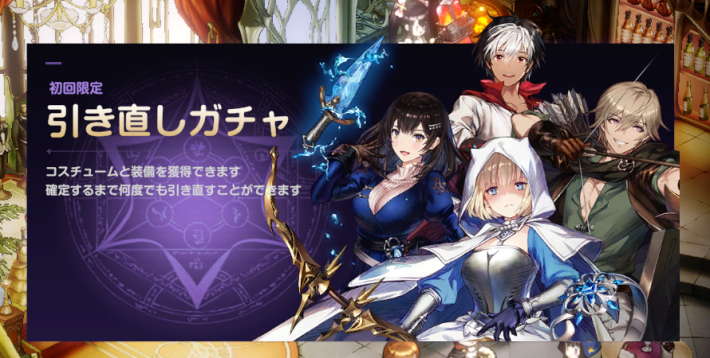 引き直しガチャは、確定するまで何度でも引き直せる初回専用のガチャです。排出されるコスチュームは決まっているので、欲しいキャラ(コスチューム)が出るまで引き直しましょう。