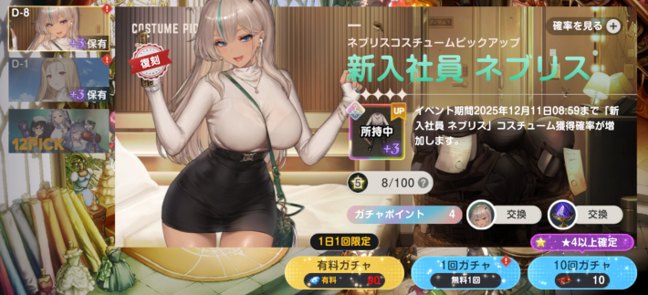 ブラウンダスト2のコスチューム(キャラ)は、コラボイベントや周年タイミングなどの一部を除いて、すべて恒常ガチャから入手可能です。限定以外はピックアップを逃してもすり抜けや交換で入手できるため、リセマラに時間をかけてまで狙うメリットは小さくなります。