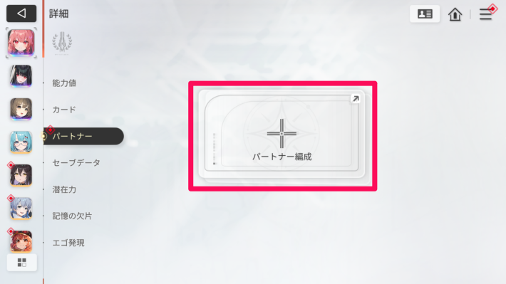 「パートナー」タブを選択後、画面中央の「パートナー編成」を押しましょう。