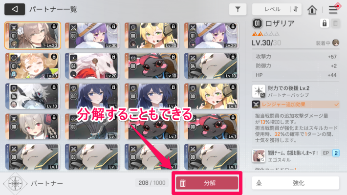 パートナーはサポートデータに分解できます。サポートデータはパートナーのレベル上げに使用するため、余った★3パートナーなどを優先的に分解しましょう。
