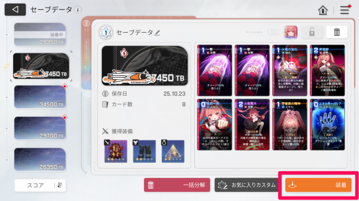 装着したいセーブデータを選んで画面右下の「装着」を押すことで戦闘員にセーブデータを装着可能です。