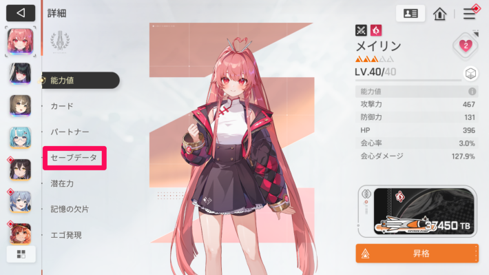 まずは、編集したい戦闘員を選びましょう。戦闘員の詳細画面に移動したら、画面左側の「セーブデータ」タブを選択します。