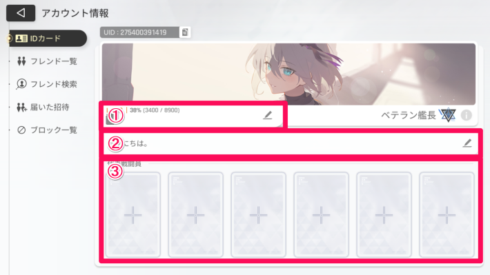 | ② | 自己紹介文設定ができます ┗プレイスタイルの記入やフレンド募集中などを設定しておきましょう |