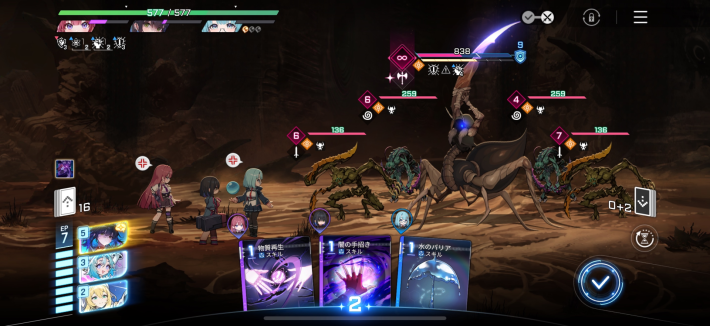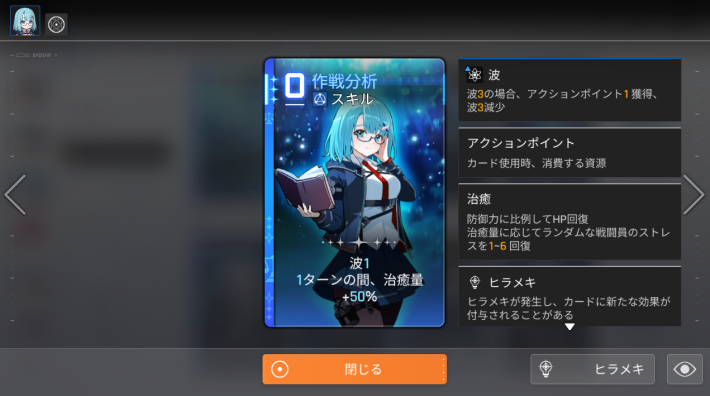 戦闘中、HPが減ってきたらミカの治癒カードを使用しましょう。「作戦分析」を使用すると1ターンの間の回復量を上げることができるので、回復する際は先に使用するようにしましょう。