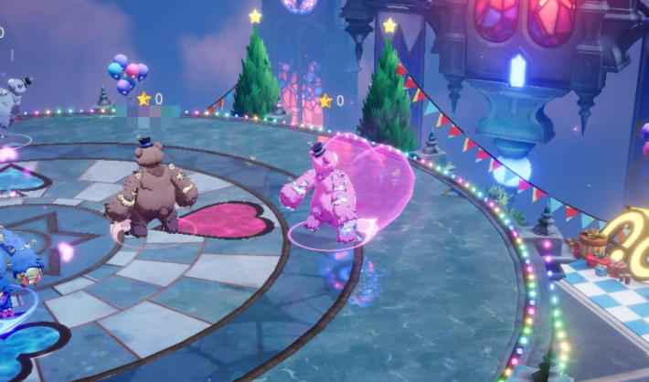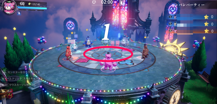 バンバンパーティーは、クマになって舞台の上で相手を落とし合うチャレンジモードです。制限時間2分のあいだに、より多くのプレイヤーを落とすことで順位が決まります。