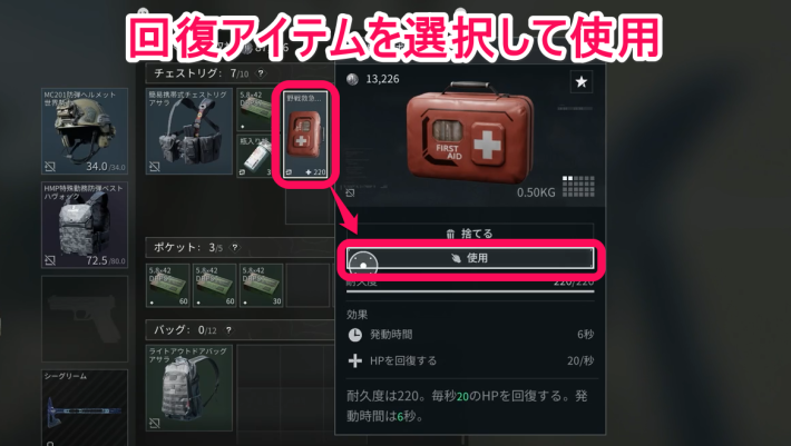 バッグ内の回復アイテムを使用する際や、周囲に敵がいない場合はバッグ画面から直接使用するのもおすすめです。耐久値や種類をすべて確認できるため、誤って使用するリスクが減ります。