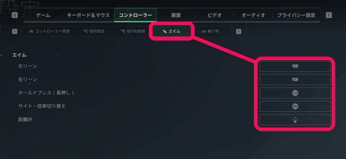 通常時は覗き込みボタンが設定されておらず、リーン動作は行えません。しかし、エイム中はボタンの内容が切り替わり、リーンが使用可能になります。