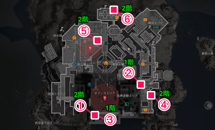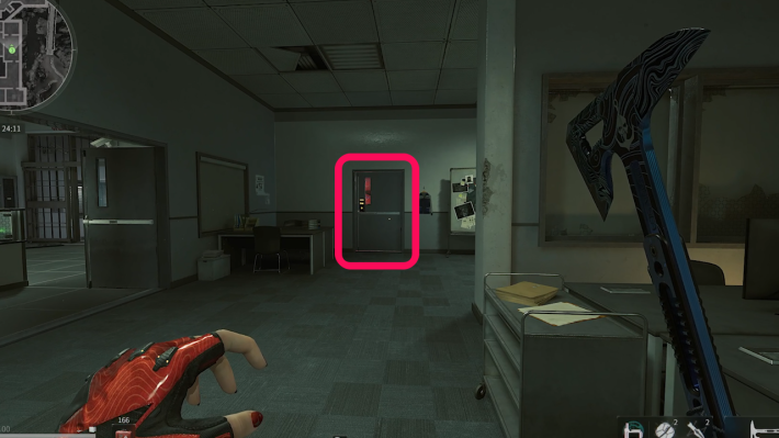 オフィスエリア2階の南側に位置する鍵部屋で、金庫が2個設置されています。小型金庫を含めると合計3個の金庫を漁れるため、高額アイテムを狙いやすいカードキーです。