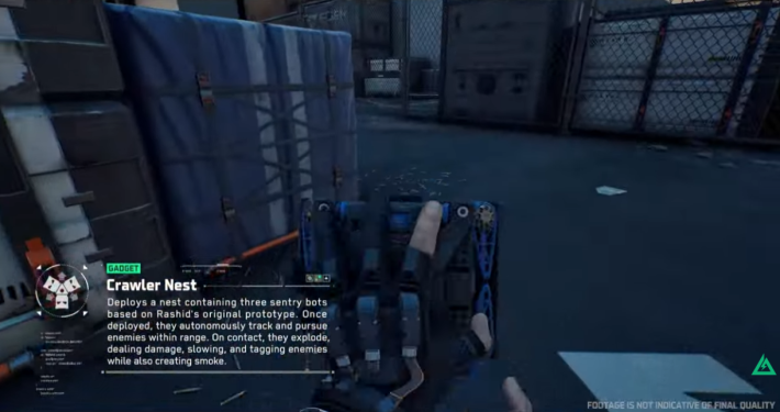 | ラシードのオリジナルプロトタイプをベースにした3体のセントリーロボットを含むネストを展開します。展開後、範囲内の敵を自律的に追跡・追尾します。接触すると爆発し、敵にダメージを与え、移動速度を低下させ、マークを付け、煙を発生させます。 |