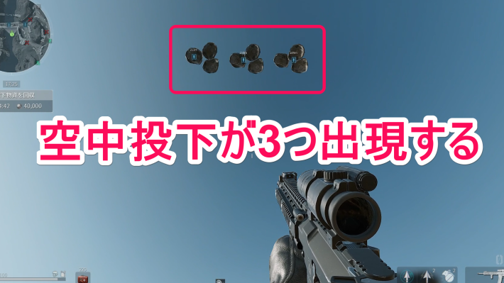 空中投下は敵プレイヤーからも視認できるため、自分たちの位置が特定されやすくなります。物資が投下されている間は、敵の襲撃に備えて周囲をしっかり警戒しましょう。