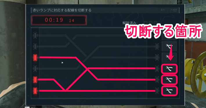 爆弾は左側で点灯している箇所と繋がっているボタンを押すことで解除できます。制限時間は20秒ですが、時間が経過しても再度チャレンジ可能です。