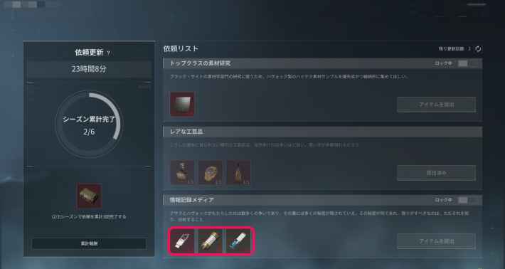 コレクターのミッションは定期的に自動更新される仕組みです。ロックなしの場合は別の依頼に切り替わるため、達成できそうなものは必ずロックしましょう。