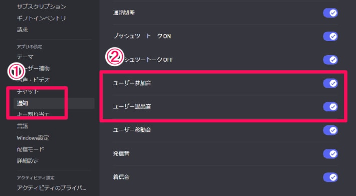 ボイスチャットの参加通知をオン/オフにする場合は、ユーザー設定の通知にある「ユーザー参加音」と「ユーザー退出音」を変更することで切り替えることができます。