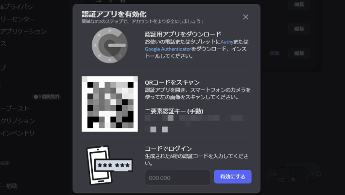 最後にDiscordの認証アプリとして使用できる「Authy」か「Google Authenticator」をダウンロードして連携すれば完了です。
