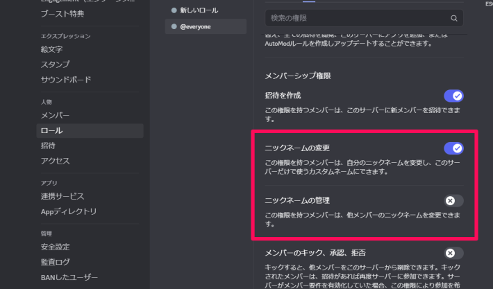 ニックネームを変更できない場合は、サーバー内の権限を確認しましょう。サーバー設定にある「ロール」からサーバーの権限を確認可能です。サーバー設定やロールが表示されない場合は、サーバー管理者に権限を確認してもらいましょう。