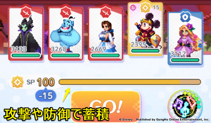 黄色アイコンのスキルを使うには、画面下部のSPが必要になります。SPは攻撃を当てるか、防御時のターン経過で増えていきます。