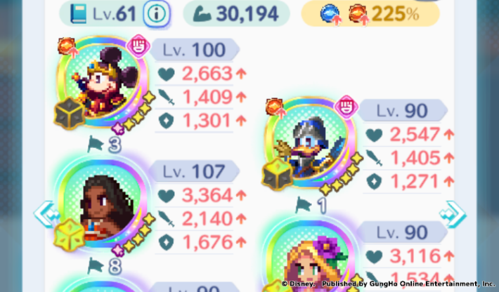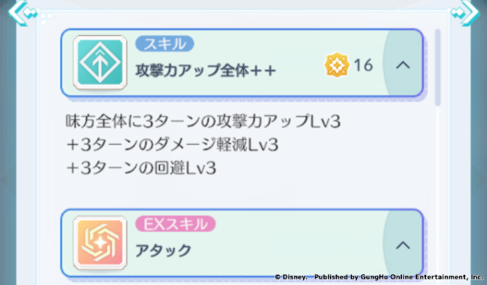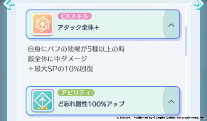 ![]() | バフ(攻撃UP/ダメージ軽減/回避) ・ラプンツェル、ミッキー、ドナルド、モアナのEX要員 ・EXで追加攻撃が可能 |