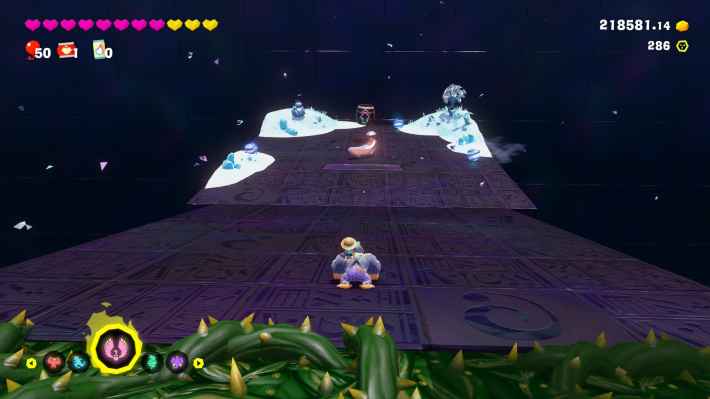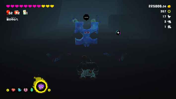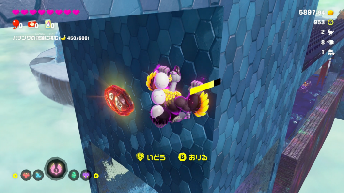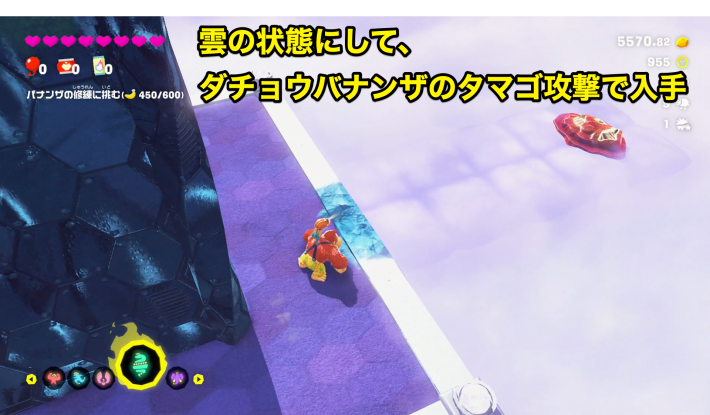 - B120371.グルミノ雲海の吊りバナナ×1周囲で移動しているスイッチに向かって破片を投げ、ヒカリとカゲを切り替えて道を作りながら進む