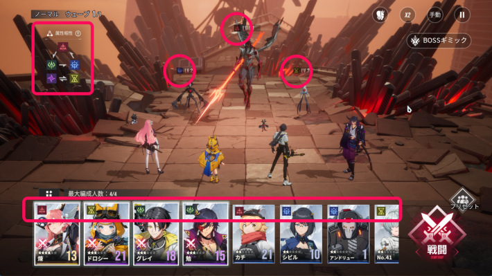 敵の属性は、戦闘開始前の準備フェーズで確認できます。左上には属性相性表が表示されているため必要に応じて確認し、有利な編成で戦いに挑みましょう。