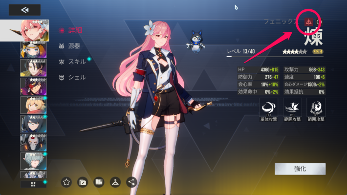 キャラ(異格者)の属性は、詳細画面の右上で確認することができます。