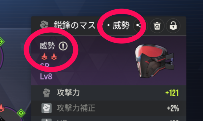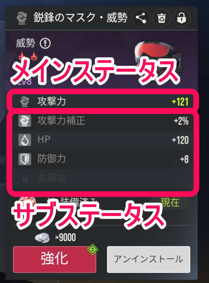 付与されるメインステータスは部位によって異なります。マスク・トランジスタ・腕輪の3部位はそれぞれ固定で、コアは10種類の候補からランダムに付与されます。