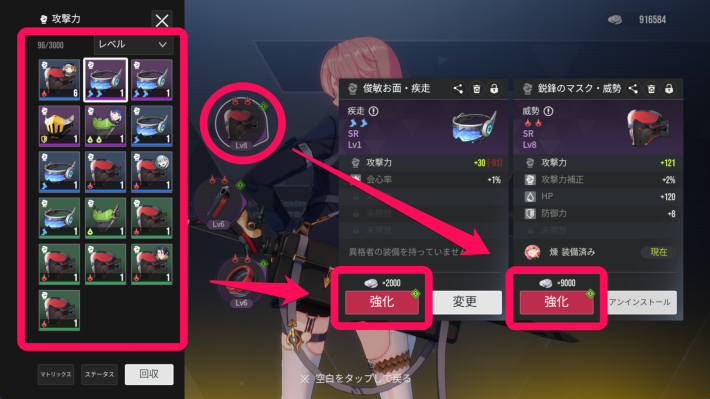 強化したい部位をタップし、強化ボタンから源器の強化ができます。また、部位をタップすることで画面左側に選択中の部位の源器リストが表示されるので、リストから装備していない源器を強化することもできます。