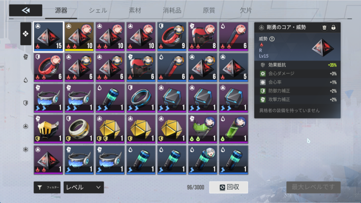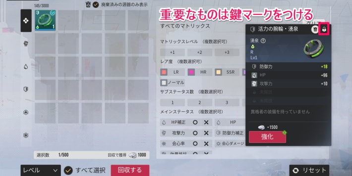 重要な源器には鍵マークをつけましょう。このチェックをつけたものは回収されなくなるので、強力な源器が入手できた時は鍵をつけて回収されないように対策しましょう。