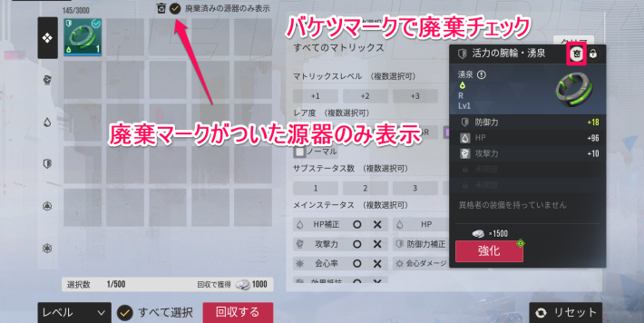 源器の廃棄マークチェックを行うことで整理がしやすくなります。個々の源器の右上のバケツマークを押すことで廃棄チェックをつけられます。廃棄マークをつけることで回収時にチェックをつけたものだけを回収することができます。