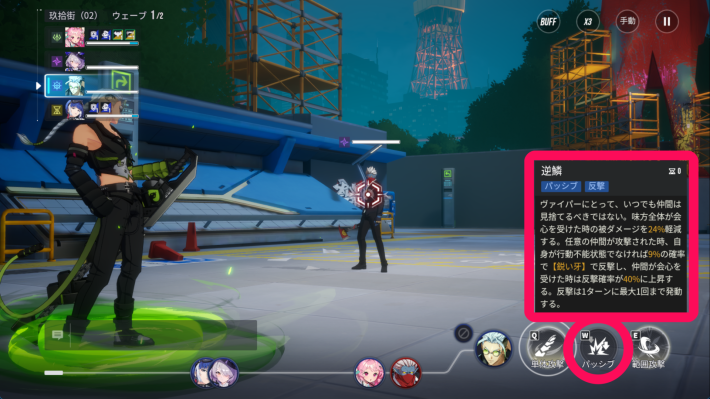 ヴァイパーは反撃で敵のバフ解除とデバフ付与を行える、攻撃と支援が一体化したキャラです。特にバフ解除の手数が多いことが強みであり、厄介なバフを持つ敵と戦うときに真価を発揮します。