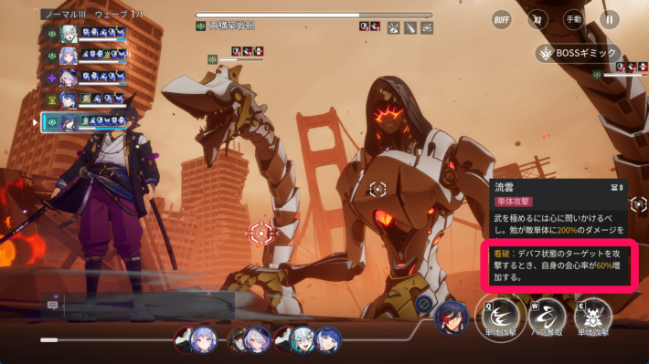 勉はデバフ状態の敵に対して攻撃するときに確定で会心を発生させます。スキル1のレベルによって上昇する会心率が変化します。