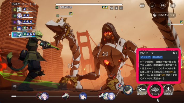 諦聴はスキル2のパッシブ効果でターン開始時にHP比率が一番低い敵をマークします。マークされた敵に対して自身の会心率が60%上昇し、超過分は150%の割合で会心ダメに変換されます。