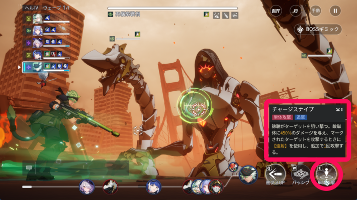 ![]() | スキルCD 3ターン最大効果 諦聴がターゲットを狙い撃つ。敵単体に450%のダメージを与え、マークされたターゲットを攻撃するときに【速射】を使用し、追加で1回攻撃する。 |
