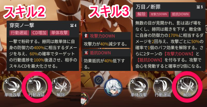 赫同は敵の行動を妨害する手段が非常に豊富です。スキル2では対象単体の全てのスキルCDを最大化(ボスには無効)し、スキル3では敵全体のバフを解除した上行動進捗を100%後退、攻撃力/